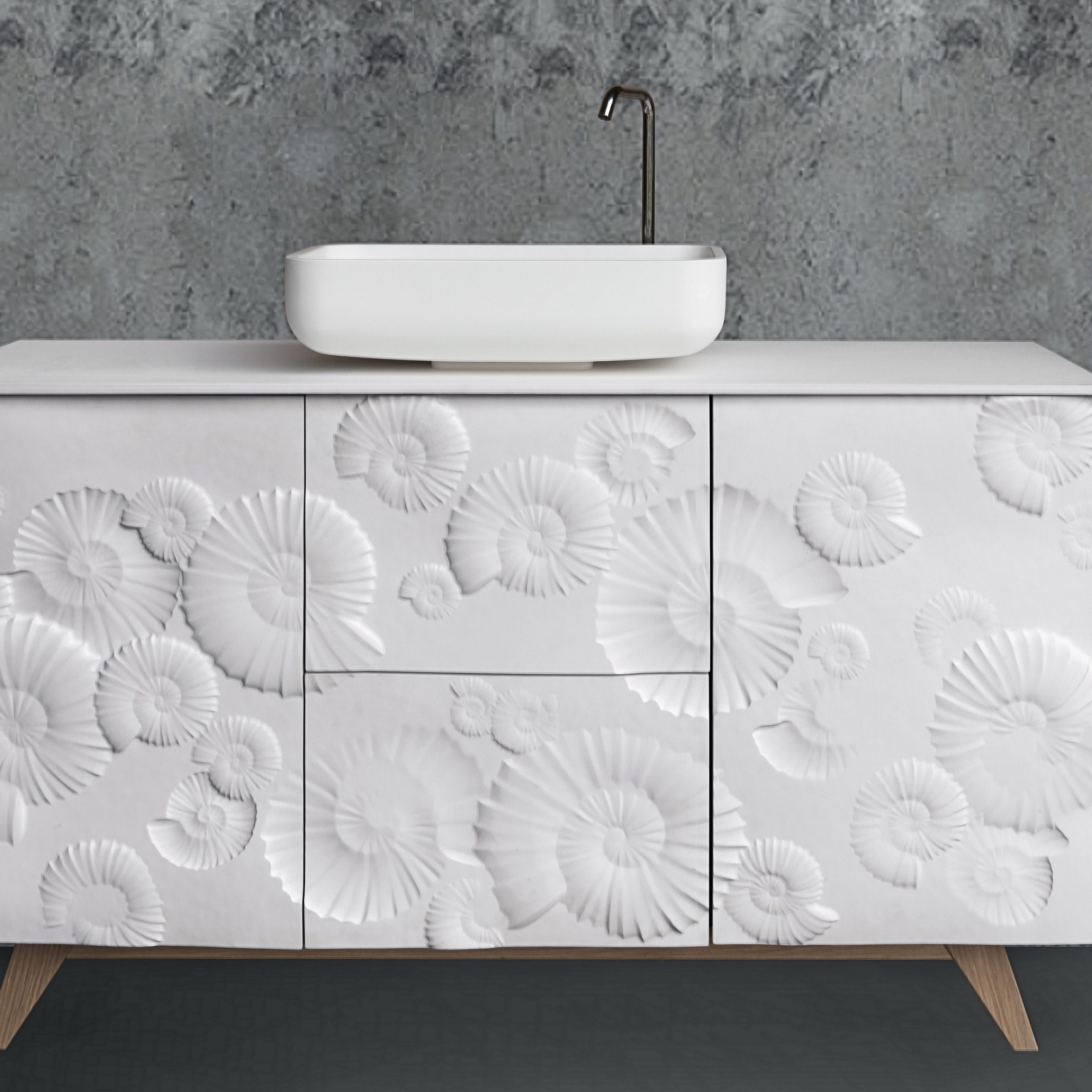 Elegante mobile da bagno in legno massello tutto intagliato, proposto in una delicata finitura bianca opaca. A richiesta può essere realizzato con una finitura leggermente invecchiata, per mettere maggiormente in risalto gli elaborati intagli.