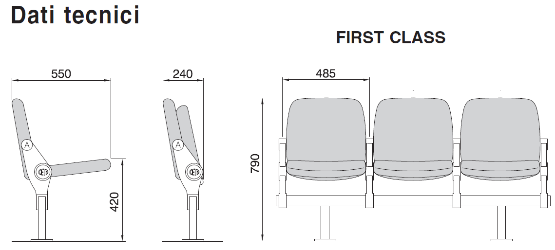 Mediante opportuni montanti in acciaio, le poltroncine FIRST CLASS vengono montate a gruppi su travi fissate al pavimento o autostabilizzanti. Inoltre le travi sono dotate all’estremità di appositi tappi di chiusura in PVC.